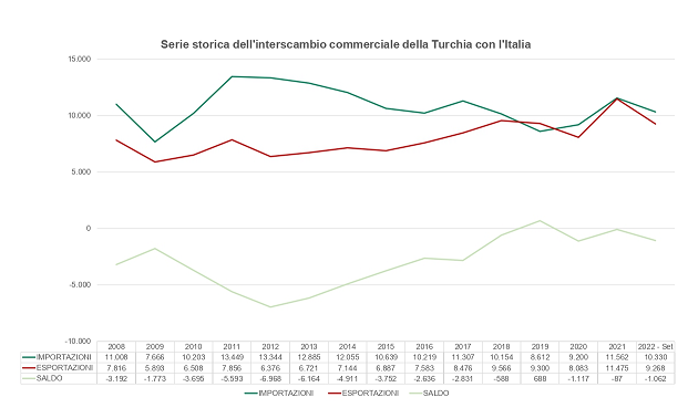 Dopo un brillante 2021, l’interscambio totale è stato pari a 23 miliardi di dollari (+33,3% rispetto all’analogo periodo dell’anno recedente), con oltre 11 miliardi e mezzo di esportazioni (un risultato in linea con un anno straordinario del Made in Italy con oltre 500 miliardi di euro di merci vendute in tutto il mondo), nel primi nove mesi del 2022, secondo i dati resi pubblici dall’Ice-Agenzia di Istanbul, l’Italia si posiziona quale 5° partner commerciale della Turchia con 19,6 miliardi di interscambio (+4,2 miliardi di dollari in più rispetto al mese precedente di agosto) e +19,1% rispetto all’analogo periodo dello scorso anno. Dopo un primo semestre che aveva visto distribuire equamente vendite e acquisti tra i due Paesi con un saldo pressoché equilibrato, il mese di in osservazione ha registrato un saldo negativo per la Turchia superiore al miliardo di dollari, raddoppiato in un solo mese.