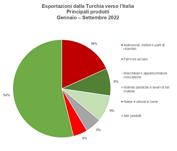 Anche nei primi nove mesi di questo anno l’Italia si conferma il 5° fornitore della Turchia (con 10,3 milioni di dollari e +23,5% rispetto all’analogo periodo dello scorso anno) dopo Federazione Russa, Cina Germania e USA mentre passa dal 3° al 5° posto in due mesi tra i più importanti clienti preceduta da Germania e Stati Uniti scavalcata da Iraq e Regno Unito, con 9,2 miliardi di dollari di merci e servizi acquistati e +14,5% rispetto ai primi nove mesi del 2021.