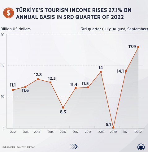 Nei primi nove mesi del 2022 le entrate derivanti dal settore turistico hanno generato più di 35 miliardi di dollari, con un aumento del 67,9% su base annua. 17,9 i miliardi di dollari ricavati dal settore nei soli tre mesi centrali estivi (in Turchia da luglio a settembre) rispetto ai 14 di un anno fa con oltre 21 milioni di presenze. Oltre il 14% delle entrate turistiche è derivato dal rientro per le vacanze estive di cittadini turchi residenti all'estero (l'11,3% del totale, pari 2 milioni e mezzo di presenze). La spesa media dei viaggiatori stranieri in Turchia per notte è stata di 89 dollari. Sempre tra gennaio e settembre i dati del Ministero della Cultura e del Turismo indicano 34,8 milioni di presenze straniere, un numero che è raddoppiato rispetto al 2021.