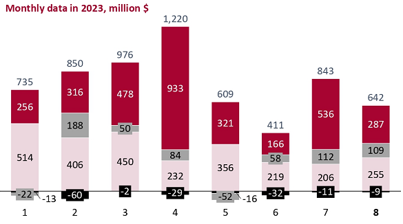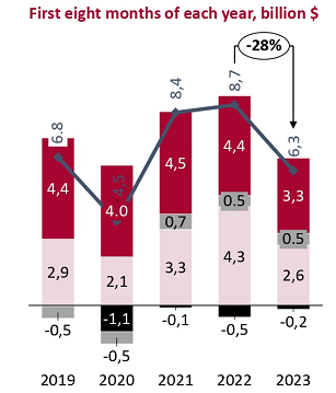 Gli IDE in ingresso nel Paese nei primi otto mesi del 2023 sono stati pari a USD 6,3 mld, in calo del 28% rispetto al periodo gennaio-agosto 2022.