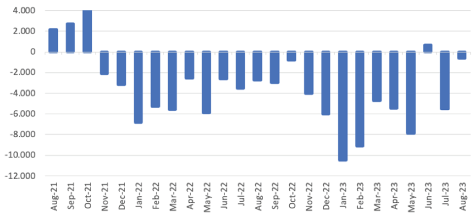 Nel mese di agosto, secondo gli ultimi dati disponibili al 3 novembre, la bilancia dei pagamenti ha registrato un deficit del conto corrente di USD 619 mln. Il saldo del conto corrente era stato in deficit anche nel mese di luglio (USD 5,5 mld) dopo l’avanzo fatto registrare a giugno (USD 693 mln) che aveva interrotto una serie di saldi negativi in atto dalla fine del 2021.