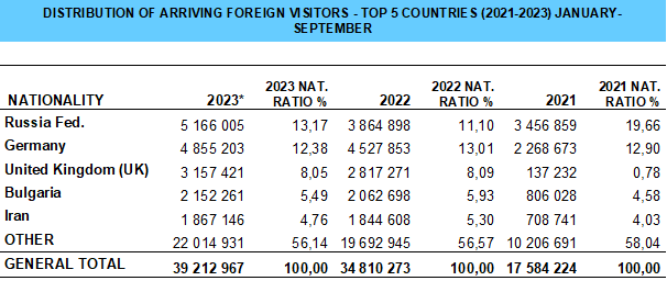 In termini di provenienza geografica, nell’arco temporale considerato, i turisti russi si sono collocati al primo posto (5,2 milioni), seguiti da tedeschi (4,8 milioni), inglesi (3,1 milioni), bulgari (2,1 milioni) e iraniani (1,8 milioni).