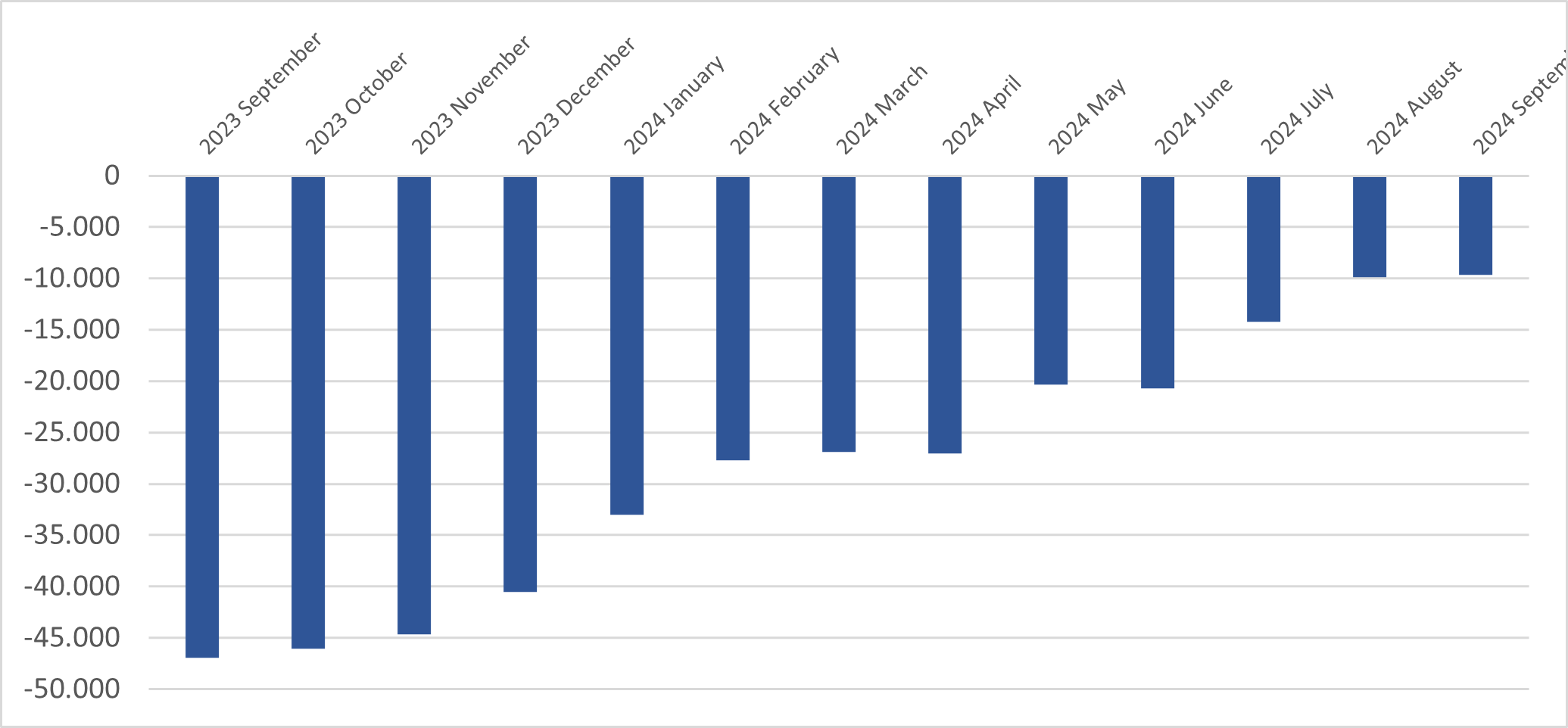 Nei mesi gennaio-ottobre 2024 è stato riportato un deficit complessivo di USD 65,8 mld, in diminuzione del 30,1% se comparato all’analogo intervallo del 2023.