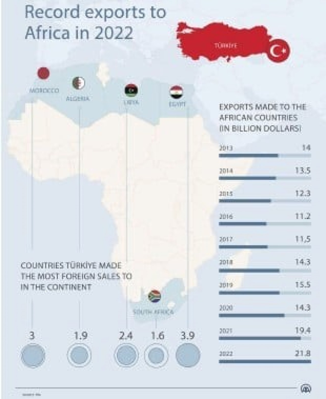 Le relazioni bilaterali con i Paesi africani hanno assunto un ruolo progressivamente crescente nel commercio internazionale della Turchia dopo l'inizio della guerra Russia-Ucraina. Gli esportatori turchi si sono dunque orientati verso mercati alternativi tra i quali quello africano è risultato tra i più redditizio nel 2022. Le esportazioni della Turchia verso i Paesi del continente africano nel 2022 hanno infatti superato i 21 miliardi di dollari (+12,3% sul 2021), raggiungendo livelli record, secondo i dati ufficiali recentemente pubblicati da TİM, la Turkish Exporters Assembly. Le vendite verso i Paesi africani hanno inoltre raggiunto quasi il 9% sulle esportazioni totali collocandosi al primo posto tra i continenti dove la Turchia lo scorso anno ha esportato di più. Tra i Paesi africani, i principali mercati di sbocco dell’export turco sono stati l'Egitto con 3,9 miliardi di dollari, il Marocco (3 miliardi), la Libia (2,4 miliardi), l'Algeria (1,9 miliardi) ed il Sudafrica con 1,6 miliardi di dollari. Tra le voci merceologiche del commercio, la chimica è stato il settore più redditizio assorbendo il maggior numero di vendite verso l’Africa con un export che si è attestato nel 2022 a 4,2 miliardi di dollari. Il settore chimico è stato seguito da quello dell'acciaio (3,1 miliardi di dollari), dei cereali, legumi, semi oleosi (2,7 miliardi), dall'industria automobilistica (1,4 miliardi) e l’elettricità con 1,3 miliardi di dollari. Meno performanti rispetto agli passati invece le esportazioni turche di prodotti agroalimentari (olive, olio d'oliva, frutta e verdura fresca), del siderurgico e del tessile. Infine, sul fronte del turismo la compagnia di bandiera Turkish Airlines (THY) con la sua presenza in 41 paesi e 62 destinazioni in Africa, è stata determinante nel contribuire all’aumento del numero di turisti. A testimonianza dell’interesse turco verso i Paesi africani il Ministro degli Esteri Mevlüt Çavuşoğlu ha effettuato un tour all’inizio di gennaio iniziato in Ruanda e proseguito in Sudafrica, Zimbabwe, Gabon e Sao Tome. Nella Repubblica Sudafricana, dove recentemente la Turchia ha aperto un suo Consolato Generale a Città del Capo, il Ministro Çavuşoğlu non ha mancato di evidenziare la centralità nell’ulteriore sviluppo dei legami commerciali tra i due Paesi. Del resto la Turchia ha aumentato il numero delle proprie Ambasciate in Africa passato da appena una dozzina del 2002 a 43 nel 2021 con l’obiettivo di portate a 50 le rappresentanze diplomatico-consolari della Turchia in tutto il continente. La Turchia nel 2022 ha ospitato diversi leader africani: il Presidente della Somalia Hassan Sheikh Mohamud Denis Sassou N'Guesso, presidente della Repubblica del Congo, il presidente del Senegal, Sall. Infine, nel maggio 2022, in occasione della Giornata dell'Africa, si è svolto il "Türkiye-Africa Media Summit" con personalità nei diversi settori economici e politici provenienti da 45 paesi africani mentre il “1° Vertice di cooperazione Türkiye-Africa” si è tenuto sempre nel 2022 ad Istanbul con una nutrita partecipazione delle delegazioni di quasi tutti i Paesi africani.