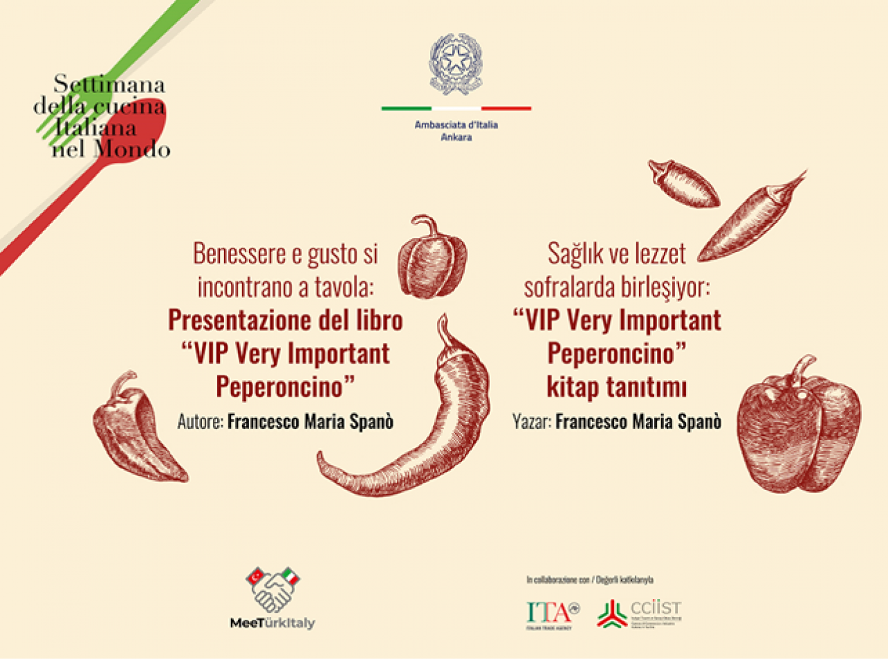In occasione della “VIII Settimana della Cucina Italiana nel Mondo” (13-19 novembre 2023), e nel quadro del ciclo di incontri “MeeTürkItaly” - canale promozionale di primario rilievo dell’Ambasciata d’Italia in Turchia - è stato ospitato su invito dell’Ambasciatore d’Italia in Turchia, Giorgio Marrapodi, a Istanbul nella prestigiosa cornice di Palazzo di Venezia, il Prof. Francesco Maria Spanò, Direttore risorse umane e cultura della LUISS e Ambasciatore dell'Accademia italiana del Peperoncino, che ha presentato il libro “VIP Very Important Peperoncino”.